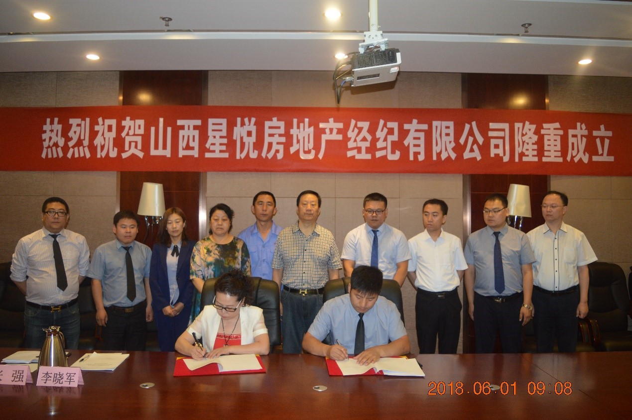 2018年6月1日上午9時,“山西星悅房地產(chǎn)經(jīng)紀有限公司成立大會暨簽約儀式”在星雅名都酒店4樓會議廳隆重舉行。集團董事長總裁郭秀忠、副總裁王文萍、郭雅維、董事長助理沈習寧、經(jīng)紀公司總經(jīng)理冉賢俊、監(jiān)事劉斌等領導出席了大會。